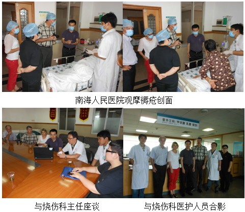 5月22號上午王教授又驅(qū)車帶領(lǐng)新西蘭一行人來到了中山市黃埔人民醫(yī)院進行參觀并受到了醫(yī)院領(lǐng)導(dǎo)以及皮膚美容科主任的熱烈歡迎。在皮膚科主任對醫(yī)院整體介紹后,一行人參觀了燒傷科病房,過程中王教授又針對不同病例進行了操作展示并耐心細致的回答了醫(yī)生護士提出的所有問題。下午一行人又轉(zhuǎn)站來到了佛山南海人民醫(yī)院燒傷科,科室由于積極開展再生醫(yī)療技術(shù)使得大面積燒傷患者病死率明顯減少。近年來又不斷擴大了應(yīng)用范圍擴展到了褥瘡與糖尿病足等創(chuàng)面的應(yīng)用也取得了非常好的療效。