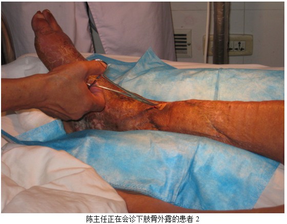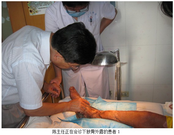 2012年8月5日中國中西醫(yī)結(jié)合學(xué)會(huì)燒傷專業(yè)委員會(huì)委員、北京美寶燒傷創(chuàng)瘍研究所臨床部專家陳全喜應(yīng)河南省新鄉(xiāng)醫(yī)學(xué)院第三附屬醫(yī)院骨科李主任和孫大夫的邀請(qǐng),會(huì)診一例下肢骨露的患者。