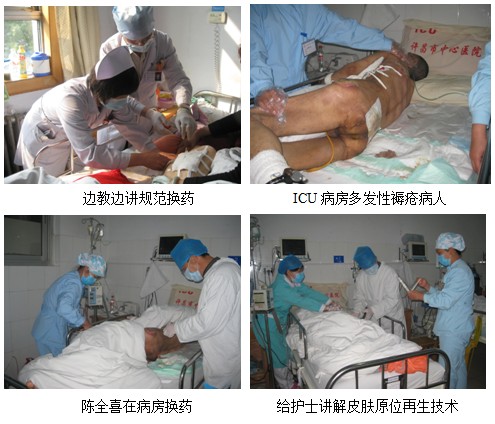 2011年11月7日上午,中國中西醫(yī)結(jié)合學(xué)會燒傷專業(yè)委員會委員,北京美寶燒傷創(chuàng)瘍研究所臨床部專家陳全喜受許昌市中心醫(yī)院ICU科主任陳建、內(nèi)分泌科主任刁建華的邀請會診兩位嚴(yán)重多發(fā)性壓瘡病人。