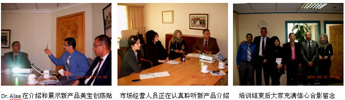 經(jīng)過美寶國際市場集團孫霞總經(jīng)理、市場部劉鋼和吳云經(jīng)理與阿聯(lián)酋海灣JULPHAR藥廠的積極聯(lián)絡(luò)、組織、策劃和安排下,分別在阿聯(lián)酋的第一大城市迪拜市和首都阿布扎比市展開了一系列的美寶創(chuàng)瘍貼新產(chǎn)品發(fā)布會、應(yīng)用培訓(xùn)和臨床示范指導(dǎo)等活動,使更多的臨床醫(yī)護人員了解了美寶創(chuàng)瘍貼的再生愈合效果和掌握了具體使用方法,美寶創(chuàng)瘍貼很受臨床醫(yī)護人員和患者的歡迎,同時為新市場的開拓打下了較好的基礎(chǔ),打響了除燒傷膏之外的另一再生醫(yī)學(xué)新產(chǎn)品的海外開發(fā)、經(jīng)營的第一炮。一、欲其事必先利其器。2011年3月12日,為了做好美寶創(chuàng)瘍貼的經(jīng)營和啟動工作,海灣JULPHAR藥廠和阿聯(lián)酋負責美寶產(chǎn)品經(jīng)營的人員主動放棄周六休息的時間進行產(chǎn)品知識培訓(xùn)。中國燒傷創(chuàng)瘍科技中心臨床部的陳永翀教授給大家講解了美寶創(chuàng)瘍貼的再生醫(yī)學(xué)機理、臨床使用方法和臨床效果,Dr. Alaa Helail則向大家做了美寶創(chuàng)瘍貼新產(chǎn)品的介紹,期間大家還認真討論和確定了接下來的幾天在迪拜市和阿布扎比市的醫(yī)療開發(fā)與產(chǎn)品發(fā)布會的具體安排。通過這次培訓(xùn),使經(jīng)營人員了解和掌握了美寶創(chuàng)瘍貼的再生愈合機理、效果,以及與其它同類競爭產(chǎn)品的區(qū)別與優(yōu)勢,大家對該產(chǎn)品的經(jīng)營充滿了信心。