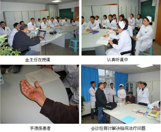 學(xué)術(shù)會(huì)議由戴主任主持,金教授先向大家介紹了燒傷及燒傷皮膚原位再生醫(yī)療技術(shù)的概念,而該技術(shù)是由濕潤暴露療法和濕潤燒傷膏來共同完成;介紹了暴露療法創(chuàng)面處理的原則、處理方式、規(guī)范換藥技術(shù)以及各類深淺度燒傷、潰瘍、褥瘡、糖尿病足、斷指再生等創(chuàng)面的處理方法;并通過展示大量真實(shí)的臨床病例圖片,使大家真正了解皮膚原位再生醫(yī)療技術(shù)及其再生產(chǎn)品的先進(jìn)性、實(shí)用性;隨后金教授介紹了再生醫(yī)療技術(shù)新產(chǎn)品—?jiǎng)?chuàng)瘍貼對(duì)壓瘡、糖尿病足潰瘍等創(chuàng)面的治療,并介紹了其作用原理、產(chǎn)品組成結(jié)構(gòu)、各類創(chuàng)面使用的方法等;還著重講解了在5.12四川災(zāi)區(qū)應(yīng)用再生醫(yī)療技術(shù)治療眾多患者所取得的良好療效。在金教授課結(jié)束后,參會(huì)人員結(jié)合實(shí)際工作中所遇的問題紛紛提問,如取皮后,使用濕潤燒傷膏或速愈貼遇滲血情況如何處理,燒傷膏油紗條如何制作,III度燒傷創(chuàng)面是否采用包扎療法等,現(xiàn)場(chǎng)氣氛十分活躍,金教授一一為大家做了細(xì)致回答,并在會(huì)議結(jié)束后對(duì)一位手部創(chuàng)傷患者進(jìn)行了會(huì)診。
