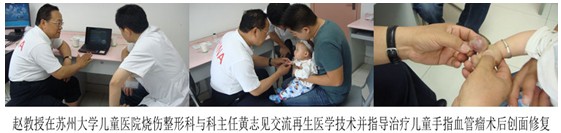 【1】7月18日趙教授在蘇州大學(xué)兒童醫(yī)院燒傷整形科與科主任黃志見交流再生醫(yī)學(xué)技術(shù)治療兒童手指血管瘤術(shù)后創(chuàng)面修復(fù)新技術(shù)。