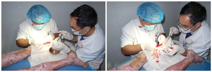 培訓結束后,趙瑞慶教授針對運動醫(yī)學科等科室醫(yī)務人員提出的臨床問題,分別作了新鮮傷口正確使用創(chuàng)瘍貼、早期防治疤痕的耐心解答。趙瑞慶還在燒傷整形科,為鐵水燒傷的病人李某某做了殘余肉芽創(chuàng)面皮簇種植術的示范操作演示。煙臺山醫(yī)院本次培訓手術演示,對該院開展多科室使用燒傷創(chuàng)瘍再生醫(yī)學與療法起到了很好的推動作用。