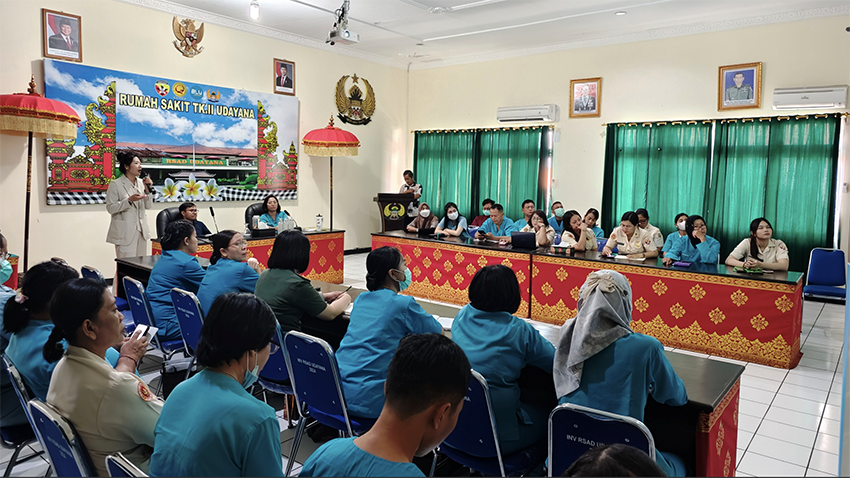 5月20日,代表團(tuán)抵達(dá)登巴薩,在Udayana Army公立醫(yī)院舉辦了首場(chǎng)技術(shù)交流會(huì)。來(lái)自外科、急診科及護(hù)理部門的醫(yī)護(hù)人員積極參與。會(huì)議伊始,美容整形外科的Widya教授就再生醫(yī)療技術(shù)在創(chuàng)面治療各階段的臨床應(yīng)用進(jìn)行了詳細(xì)講解,并結(jié)合典型病例進(jìn)行了分析。隨后,美寶國(guó)際技術(shù)部代表對(duì)再生醫(yī)療技術(shù)的核心機(jī)制及臨床優(yōu)勢(shì)進(jìn)行了深入解讀,尤其在加速愈合、減少瘢痕和降低感染率方面的顯著效果,引起在場(chǎng)人員廣泛關(guān)注。當(dāng)日下午,代表團(tuán)還參訪了Sanglah教學(xué)醫(yī)院,實(shí)地考察了該院燒傷科的臨床環(huán)境,并與一線醫(yī)護(hù)人員圍繞再生醫(yī)療技術(shù)的本地化應(yīng)用進(jìn)行了深入交流。