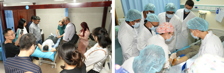 9月16日,代表團(tuán)首站訪問湖南中醫(yī)藥大學(xué)第二附屬醫(yī)院。醫(yī)院黨委副書記游柏穩(wěn)代表院方致歡迎辭。隨后,皮膚中心創(chuàng)面修復(fù)科副主任田毅與侯玉潔醫(yī)生分別就典型病例進(jìn)行了分享,以深入淺出的方式介紹了再生醫(yī)療技術(shù)在創(chuàng)面管理中的應(yīng)用機(jī)制,使代表團(tuán)對(duì)該技術(shù)有了更深入的理解。分享結(jié)束后,代表團(tuán)前往針灸推拿康復(fù)中心,參觀并親身體驗(yàn)了針灸、閃罐等傳統(tǒng)中醫(yī)治療方法。隨后,代表團(tuán)走進(jìn)創(chuàng)面修復(fù)科病房,現(xiàn)場(chǎng)觀摩了應(yīng)用再生醫(yī)療技術(shù)為糖尿病足及放射性皮炎患者規(guī)范換藥的全過程,并就放射性皮炎在創(chuàng)面處理中的難點(diǎn)與關(guān)鍵治療環(huán)節(jié)進(jìn)行了交流。參觀環(huán)節(jié)結(jié)束后,雙方專家再度座談,圍繞慢性創(chuàng)面治療的最新進(jìn)展、中馬兩國(guó)醫(yī)療體系的差異等議題展開了深入討論。