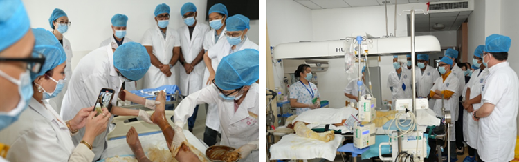 9月18日,代表團(tuán)赴瀏陽市開展醫(yī)療交流,先后訪問了瀏陽市中醫(yī)院與瀏陽市人民醫(yī)院。兩家醫(yī)院在再生醫(yī)療技術(shù)臨床應(yīng)用方面均擁有深厚積累,尤其在大面積燒傷綜合救治領(lǐng)域成效顯著。當(dāng)日上午,代表團(tuán)首先到訪瀏陽市中醫(yī)院,在燒傷科主任朱樹昌的陪同講解下,代表團(tuán)實(shí)地了解到了翻身床、懸浮床、紅外線照射等設(shè)備在大面積燒傷治療中的輔助應(yīng)用,并就中西醫(yī)結(jié)合模式在提升創(chuàng)面修復(fù)效果與患者滿意度方面的實(shí)踐路徑,進(jìn)行了深入交流。下午,代表團(tuán)轉(zhuǎn)赴瀏陽市人民醫(yī)院。周明亮院長(zhǎng)結(jié)合典型病例,系統(tǒng)介紹了該院將大面積燒傷創(chuàng)面的治療經(jīng)驗(yàn)轉(zhuǎn)化應(yīng)用于慢性難愈合創(chuàng)面的臨床策略與關(guān)鍵技術(shù)。隨后,皮膚醫(yī)學(xué)中心主任蔣章佳與燒傷重建創(chuàng)面修復(fù)科主任焦獻(xiàn)功共同展示了獲專利認(rèn)證的醫(yī)院自研設(shè)備——磨痂器及環(huán)鉆治療術(shù),借助臨床案例生動(dòng)演示了該技術(shù)在處理大面積燒傷創(chuàng)面、慢性難愈合創(chuàng)面及瘢痕綜合管理中的顯著療效。訪問期間,代表團(tuán)還與兩院醫(yī)護(hù)人員圍繞再生醫(yī)療技術(shù)的規(guī)范化實(shí)施、治療流程優(yōu)化及植皮手術(shù)操作要點(diǎn)等議題,開展了廣泛而專業(yè)的座談交流。