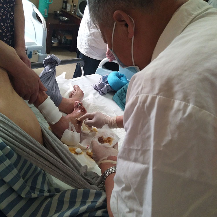 5月21日下午,北京榮祥再生醫(yī)學(xué)研究所副所長(zhǎng)、中國(guó)中西醫(yī)結(jié)合學(xué)會(huì)燒傷專(zhuān)業(yè)委員會(huì)常務(wù)委員、《燒傷創(chuàng)瘍雜志》副總編輯、應(yīng)用燒傷創(chuàng)瘍?cè)偕t(yī)療技術(shù)治療糖尿病足領(lǐng)域?qū)<摇⒀芯繂T王洪生教授應(yīng)邀前往廣東省四會(huì)市萬(wàn)隆醫(yī)院會(huì)診6例病人,其中一例燒傷病人達(dá)40%、三度燒傷達(dá)10%的重度燒傷,王教授指導(dǎo)并帶領(lǐng)全科主任醫(yī)生護(hù)理共6人在病房換藥,并在此過(guò)程中糾正一些不規(guī)范的換藥事項(xiàng),效果明顯。
