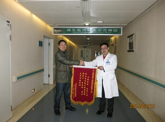 為感謝湘雅三醫(yī)院燒傷科開拓創(chuàng)新,大膽采用人體再生復(fù)原技術(shù)根治肛瘺術(shù)后感染創(chuàng)面,患者周某特制錦旗兩面分別送給賀全勇教授和郭夢茜醫(yī)生。