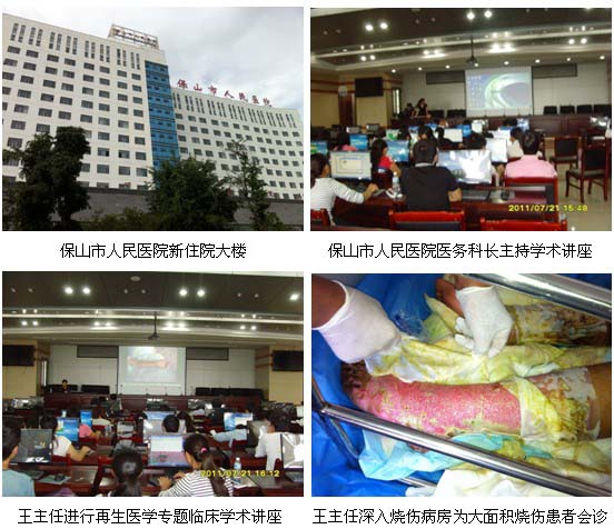 當日下午2:30學術(shù)講座在保山市人民醫(yī)院電化教學廳舉行,該醫(yī)院醫(yī)務科長主持了學術(shù)講座,王主任應邀以“再生復原療法在燒傷和難治性創(chuàng)傷潰瘍創(chuàng)面臨床規(guī)范化處理及新進展”為題進行了專題臨床學術(shù)講座。在學術(shù)講座中,王主任以大量的臨床實例及錄像治療直觀而深入淺出的介紹不同深度燒傷創(chuàng)面的規(guī)范化處理及各種難愈性創(chuàng)面的臨床治療要點,大量典型臨床病例的展示,看得在場醫(yī)護人員目瞪口呆。然后王主任又以汶川地震中的傷員為例講了擠壓傷和鋼板外露等創(chuàng)面的處理方法,兩個多小時的精彩講述贏得了在場醫(yī)護人員的一次又一次熱烈的掌聲。會后應保山市人民醫(yī)院醫(yī)務科及燒傷科楊主任的邀請,王主任來到該醫(yī)院燒傷科為一例汽油火焰燒傷總面積達60%TBSA大面積患者會診,患者家屬感動的說我女兒真有福。