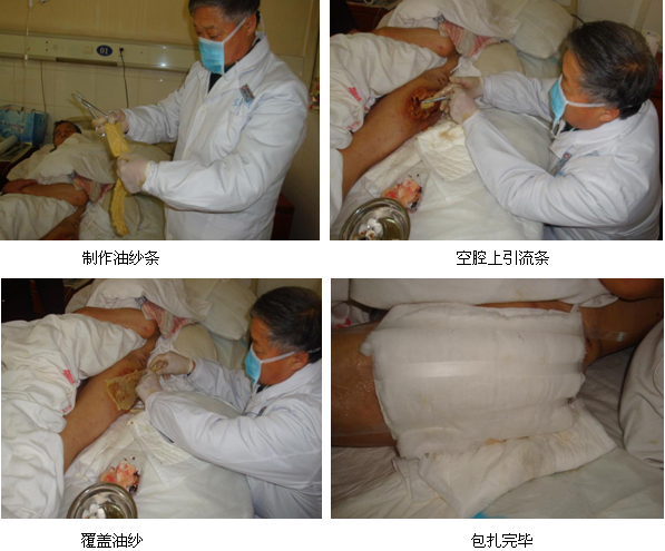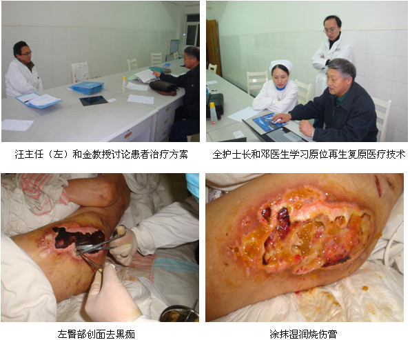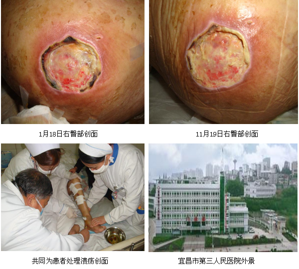 2010年12月17日至12月19日,中國(guó)中西醫(yī)結(jié)合學(xué)會(huì)燒傷專業(yè)委員會(huì)金黨軍教授在對(duì)宜昌市各醫(yī)院走訪期間,應(yīng)該院外科汪長(zhǎng)青主任和全麗麗護(hù)士長(zhǎng)的邀請(qǐng),對(duì)剛?cè)朐旱囊晃荒X梗塞偏癱老年患者多發(fā)性褥瘡創(chuàng)面進(jìn)行了臨床換藥指導(dǎo)。該患已79歲高齡,金教授見(jiàn)到患者時(shí),背部褥瘡結(jié)黑痂,左臀部形成空腔,這兩處面積較大,伴有惡臭;另右臀部、膝蓋、左小腿及左腳均有潰瘍創(chuàng)面,并伴低蛋白血糖和疝氣。在全護(hù)士長(zhǎng)等護(hù)士的陪同下,金教授為患者耐心地清洗周邊的創(chuàng)面,剪去黑痂,空腔上使用濕潤(rùn)燒傷膏油紗條填塞,并采用藥膏和創(chuàng)瘍貼結(jié)合換藥,金教授通過(guò)兩個(gè)多小時(shí)實(shí)際操作,詮釋了再生醫(yī)療技術(shù)對(duì)創(chuàng)面的處理要點(diǎn),隨后金教授結(jié)合多媒體材料為現(xiàn)場(chǎng)的醫(yī)護(hù)人員講解了再生醫(yī)療技術(shù)在燒傷、創(chuàng)瘍、褥瘡、潰瘍等創(chuàng)面的應(yīng)用,講課結(jié)束后,現(xiàn)場(chǎng)的醫(yī)護(hù)人員表示通過(guò)看到金教授親自為患者換藥及他精彩地講課,使大家實(shí)實(shí)在在地掌握了原位再生復(fù)原醫(yī)療技術(shù)的規(guī)范換藥及其在臨床各科室的廣泛應(yīng)用,今后會(huì)不斷提高原位再生復(fù)原醫(yī)療技術(shù)水平,救治更多患者。