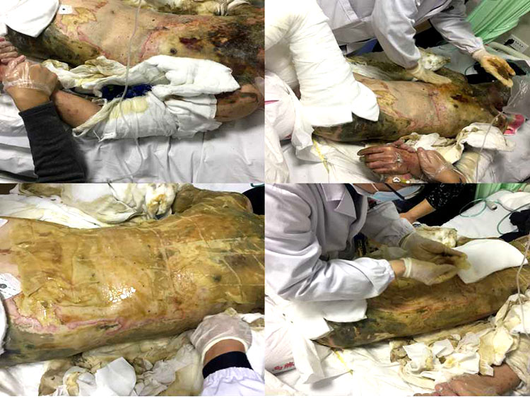 李主任陪同金教授與劉群峰醫(yī)生,張耀武醫(yī)生,鄭孟杰醫(yī)生,王帥醫(yī)生及于海洋醫(yī)生,共同會診了五位燒燙傷患者,一位雙足凍傷患者,一位疑似下肢栓塞并感染患者和一位丹毒患者。各位醫(yī)師在進行再生醫(yī)療技術規(guī)范換藥過程中,積極同金教授探討技術要點,如:怎樣探查壞死組織的深淺;創(chuàng)面壞死組織削除深淺及技巧等。當大家會診到一位70%大面積燒傷高齡患者時,在金教授和李主任的帶領下,科室全體總動員,大家密切配合,規(guī)范操作,歷時近兩個小時完成創(chuàng)面治療!