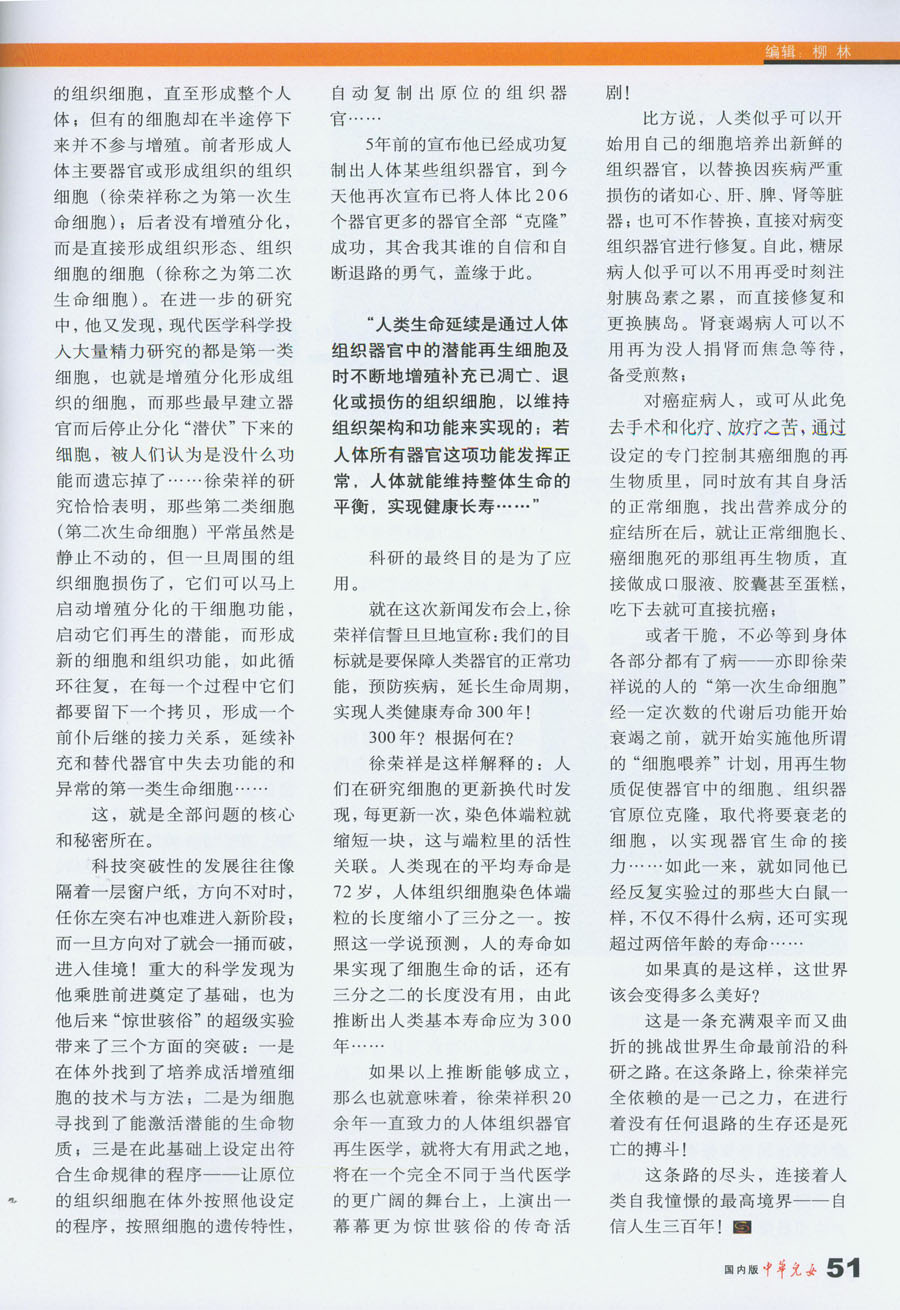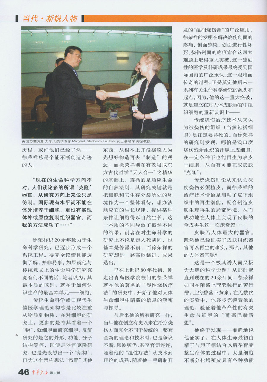 2002年8月1 6日,備受爭議的醫(yī)學(xué)科學(xué)工作者徐榮祥教授通過媒體宣布,他和他的研究團(tuán)隊經(jīng)數(shù)年努力.在人體原位和體外成功復(fù)制出了組織器官!同時宣布,將用5年時間“克隆”出人體所有組織器官.同時破解癌癥之謎!這一爆炸性的新聞,震驚了醫(yī)學(xué)科學(xué)界,一時間質(zhì)疑聲四起。同年的《中華兒女》第1 0期上,就以《驚世駭俗徐榮祥》為題,詳細(xì)報道了他別辟蹊徑的生命科學(xué)研究之路。