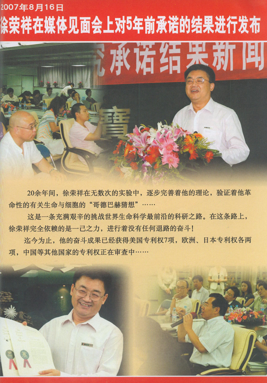 時間也許能說明一切。當(dāng)徐榮祥5年后的今天再次在閃光燈的包圍下,宣布他已經(jīng)完成了比206個組織器官更多的實驗性臨床組織器官克隆復(fù)制、完成了腫瘤細(xì)胞系轉(zhuǎn)變的研究,以及他的組織器官相關(guān)技術(shù),已經(jīng)獲得美國專利權(quán)7項,歐洲、日本專利權(quán)各兩項時,在場人士驚奇是驚奇,但與5年前相比,已然平靜了許多?;赝徱曅鞓s祥20余年所走過的風(fēng)雨歷程,或許他們已經(jīng)了然一一徐榮祥總是個能不斷創(chuàng)造奇跡的人。