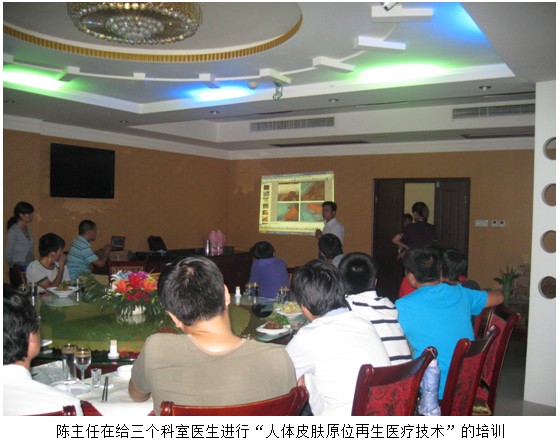 陳全喜主任就皮膚原位再生醫(yī)療技術(shù)做了專題報(bào)告,展示了應(yīng)用人體皮膚原位再生醫(yī)療技術(shù)治愈的急診科燒傷、擦傷、骨科、竇道、骨外露、骨髓炎、內(nèi)分泌周圍血管的潰瘍、糖尿病潰瘍足的治療,婦科手術(shù)應(yīng)用再生醫(yī)療技術(shù)治療病例對(duì)照。會(huì)議剛結(jié)束,急診科主任裴光耀表示希望在陳主任的指導(dǎo)下盡快將該項(xiàng)技術(shù)應(yīng)用。婦科、骨科主任也表示要進(jìn)入臨床應(yīng)用,在晚宴上大家又進(jìn)行了進(jìn)一步的交流,李帥經(jīng)理參加了培訓(xùn)班。
