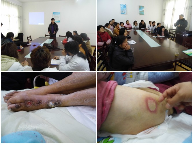 湖北省區(qū)黃彥勇陪同金老師頂風(fēng)冒雨,來到黃州區(qū)人民醫(yī)院。正在創(chuàng)立中的黃州區(qū)老年公寓,是屬于醫(yī)療養(yǎng)老范疇的一種新型模式,設(shè)計同時能容納300人左右護(hù)理能力的中型公寓,由黃州區(qū)人民醫(yī)院選派有經(jīng)驗的醫(yī)師及護(hù)理人員,初級階段收養(yǎng)了60多位老年人。金黨軍老師在講課前與王飛燕主任做了溝通,之后為全體醫(yī)護(hù)人員做了再生醫(yī)療技術(shù)對燒燙傷,以及壓瘡、各種難治性潰瘍的治療原理和原則,結(jié)合實例圖片視頻,對學(xué)員們感興趣的壓瘡護(hù)理,糖尿病足治療方案等老年病患等,做了深入淺出的講解。