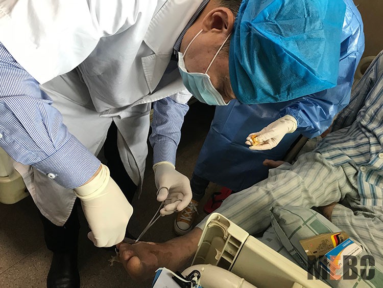 10月28日,北京榮祥再生醫(yī)學(xué)研究所副所長(zhǎng)、中國(guó)中西醫(yī)結(jié)合學(xué)會(huì)燒傷專業(yè)委員會(huì)常務(wù)委員、《燒傷創(chuàng)瘍雜志》副總編輯、應(yīng)用燒傷創(chuàng)瘍?cè)偕t(yī)療技術(shù)治療糖尿病足領(lǐng)域?qū)<?、研究員王洪生教授應(yīng)邀來(lái)到佛山市南海區(qū)人民醫(yī)院燒傷整形科會(huì)診一例40%燒傷患者,并應(yīng)邀指導(dǎo)該科8例燒傷、糖足、大壓瘡患者換藥,臨床幫帶效果明顯。