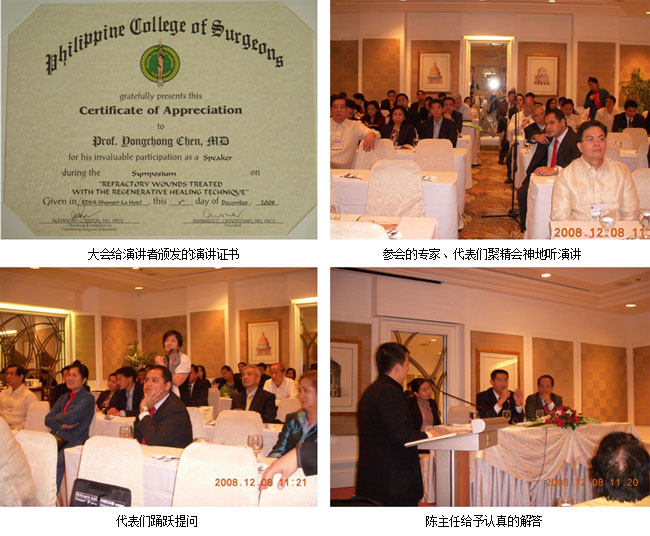 第64屆菲律賓外科醫(yī)師學會(Philippines College of Surgeons)學術(shù)年會于2008年12月8日至11日,在菲律賓首都馬尼拉市香格里拉酒店隆重召開。菲律賓外科醫(yī)師學會的學術(shù)年會是每年召開一次的全國性醫(yī)學大會,會議涵蓋的學科有“普通外科專業(yè)”、“整形整容與重建外科專業(yè)”、“骨科創(chuàng)傷專業(yè)”等十二個專業(yè)和領(lǐng)域。參加大會的有來自全國20多個省、市的專家和學者1500多人,是每年全國外科醫(yī)師相聚一堂進行學術(shù)交流的盛會。其中,參加本次“整形整容與重建外科專業(yè)”專題會議的專家代表有約90人。中國中西醫(yī)結(jié)合學會燒傷專業(yè)委員會委員、中國燒傷創(chuàng)瘍科技中心臨床部主任陳永翀應(yīng)邀出席本次大會并做專題演講。