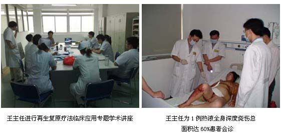 為讓該醫(yī)院燒傷外科的醫(yī)護(hù)人員盡快掌握、應(yīng)用原位再生復(fù)原醫(yī)療技術(shù)救治大面積深度燒傷,2011年5月4日,中國(guó)中西醫(yī)結(jié)合學(xué)會(huì)燒傷專業(yè)委員會(huì)常委、中國(guó)燒傷創(chuàng)瘍雜志社副總編輯、北京燒傷創(chuàng)瘍研究所副所長(zhǎng)、臨床部主任王洪生研究員應(yīng)邀到該醫(yī)院為一例成人大面積深度燒傷患者會(huì)診,指導(dǎo)對(duì)該患者的救治,為確保該患者的成功救治及讓該醫(yī)院燒傷外科的醫(yī)護(hù)人員全面掌握對(duì)大面積深度燒傷規(guī)范的臨床處理和全身綜合治療技術(shù),2011年5月12日,王洪生主任再次蒞臨該醫(yī)院,跟蹤指導(dǎo)對(duì)該例大面積深度燒傷的救治工作,當(dāng)日上午,在為該患者會(huì)診后,北海市中醫(yī)醫(yī)院普外科(燒傷外科,神經(jīng)、泌尿外科)主任史國(guó)恩和副主任蔡漢章及其科室醫(yī)生護(hù)士強(qiáng)烈要求王主任給他們做一個(gè)詳細(xì)的再生復(fù)原療法療法臨床應(yīng)用學(xué)術(shù)講座,王主任欣然接受了他們的請(qǐng)求,在該科室醫(yī)生辦公室以“再生復(fù)原療法技術(shù)在大面積深度燒傷及難愈性創(chuàng)瘍創(chuàng)面臨床規(guī)范化處理”為題為該科室的醫(yī)護(hù)人員進(jìn)行了專題講座。在學(xué)術(shù)講座中,王主任對(duì)燒傷的深度劃分結(jié)合臨床圖片做了生動(dòng)的講解,對(duì)燒傷創(chuàng)面前期和后期的處理方法、抗感染、營(yíng)養(yǎng)支持療法、臟器功能保護(hù)、并發(fā)癥防治,并結(jié)合大量的臨床圖片對(duì)各種難愈性創(chuàng)傷,潰瘍創(chuàng)面的規(guī)范處理方法與技巧做了詳細(xì)地講解。