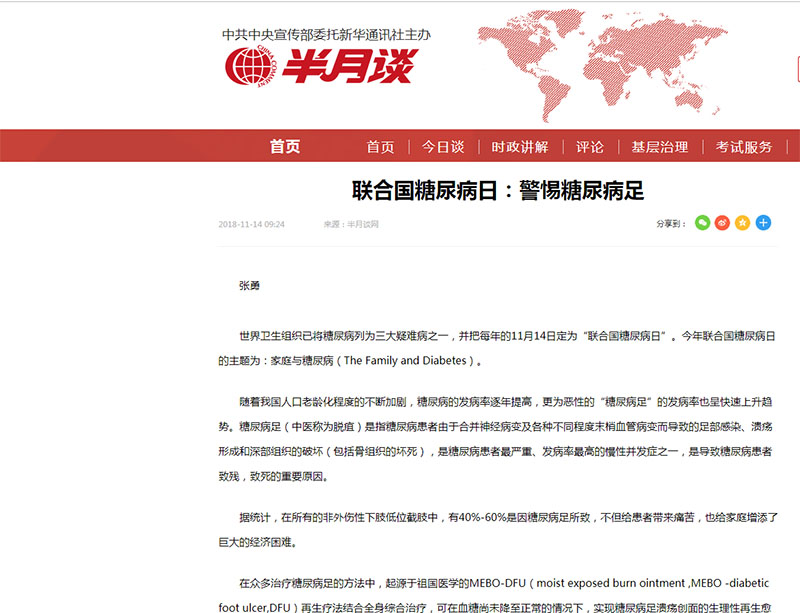 2018年11月14日,聯(lián)合國糖尿病日,中央級(jí)新聞媒體“半月談”在其網(wǎng)站健康欄目首頁刊發(fā)中國中西醫(yī)結(jié)合學(xué)會(huì)燒傷專委會(huì)常務(wù)委員、《中國燒傷創(chuàng)瘍》雜志編輯委員會(huì)常務(wù)委員張勇撰寫的“聯(lián)合國糖尿病日:警惕糖尿病足”一文。