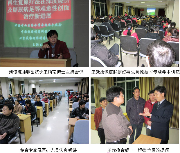 在學(xué)術(shù)講座中,王教授首先向與會(huì)醫(yī)護(hù)人員介紹了我國著名生命科學(xué)家、醫(yī)學(xué)家徐榮祥教授在人體再生復(fù)原科學(xué)領(lǐng)域取得的實(shí)驗(yàn)及臨床研究最新進(jìn)展,在2010年年底公布的“人體生命延續(xù)之謎(二)——線粒體主導(dǎo)日常生命”,破解了“精、氣、神、力”旺盛與人體啟動(dòng)了再生生命程序有關(guān),與細(xì)胞內(nèi)各主要細(xì)胞器功能的發(fā)揮有關(guān),并進(jìn)一步證實(shí)了一個(gè)生命體可以同時(shí)具有“基本生命”和“再生生命”等,接下來王教授結(jié)合了大量的臨床病例圖片,針對(duì)不同深度的燒傷創(chuàng)面及各類難愈性創(chuàng)傷、潰瘍創(chuàng)面的規(guī)范化處理方法與技巧、注意事項(xiàng)等進(jìn)行了細(xì)致地講解,著重講了再生療法在糖尿病足及其他難愈性創(chuàng)傷、創(chuàng)面中的應(yīng)用,特別介紹了該項(xiàng)技術(shù)已經(jīng)在各地醫(yī)院大量應(yīng)用于臨床,并且取得了非常好的療效,與會(huì)的醫(yī)護(hù)人員看到大量真實(shí)的臨床病例資料圖片后,都被皮膚原位再生復(fù)原技術(shù)良好的治愈效果所震撼。這次講座一直持續(xù)到晚上9時(shí)40分結(jié)束。