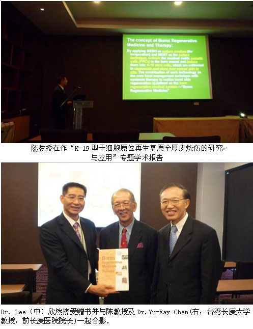 Dr. Lee在聽完陳教授的報告后激動的說:“我們新加坡總醫(yī)院20年前完成了國際上第個MEBO的臨床實驗,當時的100多例在臨床上取得了與其它方法一樣滿意的效果,我們當時知道美寶會有神奇的效果,但不知道其原因是什么,現(xiàn)在聽了你的報告,這是干細胞原位再生的結果!這是很令人振奮的!我對你們K19的實驗很感興趣,如果除了免疫熒光外,還有其它的實驗數(shù)據(jù)就更好了,希望美寶發(fā)展的更好!”他在會后欣然接受了陳教授所贈徐榮祥教授的專著Burns Regenerative Medicine and Therapy. 并表示希望能與美寶有更好地合作,也請美寶團隊轉達對徐榮祥教授的誠摯問候!