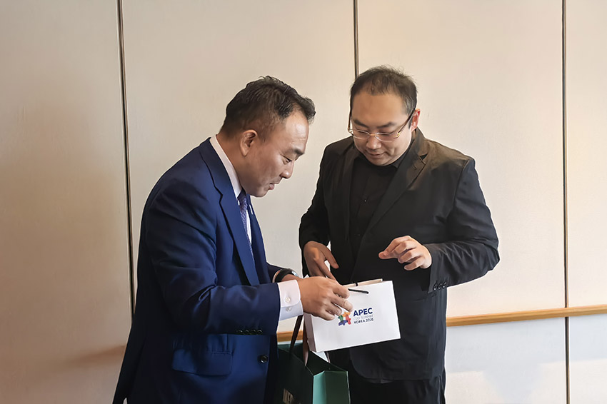 會(huì)后,雙方互贈(zèng)具有深厚APEC淵源的紀(jì)念禮品。 李成宇副會(huì)長(zhǎng)向徐鵬主席贈(zèng)送了韓國(guó)2025年APEC領(lǐng)導(dǎo)人峰會(huì)官方紀(jì)念幣套裝。徐鵬主席則回贈(zèng)了美寶燒傷膏(韓國(guó)在售版本)以及MIAGE高端護(hù)膚品套裝。這兩份回贈(zèng)禮品均承載著往屆APEC的印記:MIAGE產(chǎn)品是2023年美國(guó)舊金山APEC領(lǐng)導(dǎo)人峰會(huì)官方禮品袋的重要成員;而美寶燒傷膏則是2024年秘魯利馬APEC領(lǐng)導(dǎo)人峰會(huì)的官方禮品之一。此次互贈(zèng),不僅體現(xiàn)了雙方的情誼,更巧妙地串聯(lián)起歷屆APEC峰會(huì)的深厚淵源。