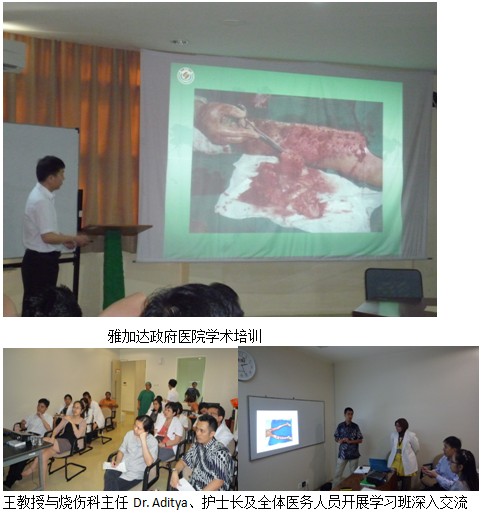 醫(yī)療開(kāi)發(fā)期間,還會(huì)見(jiàn)了雅加達(dá)政府醫(yī)院燒傷科主任Dr. Aditya,該醫(yī)生也早在09年赴四川進(jìn)行再生醫(yī)療培訓(xùn),多年來(lái)一直應(yīng)用再生醫(yī)療技術(shù)及微粒體種植等革新技術(shù)治療多例大面積燒傷,創(chuàng)傷病人,曾于2011年在亞太燒傷外科會(huì)議上做再生技術(shù)演講,在再生技術(shù)的推廣應(yīng)用上做出了卓越的貢獻(xiàn)。此行王教授來(lái)訪(fǎng)與Dr. Aditya再次會(huì)面,受到了他及其整個(gè)科室人員的熱情接待并連續(xù)做了兩天的深入培訓(xùn)與交流,主要針對(duì)再生技術(shù)在大面積燒傷的補(bǔ)液原則及方法、抗生素、營(yíng)養(yǎng)支持及多器官保護(hù)等系統(tǒng)療法、微粒體種植術(shù)、耕耘剪張、薄化、開(kāi)窗等創(chuàng)面處理技術(shù)上做了系統(tǒng)詳細(xì)的講解與討論,尤其是電擊傷、吸入性損傷等特重度患者的救治做了典型病例的分析與展示。所有醫(yī)務(wù)人員全程認(rèn)真做了筆記,針對(duì)每一個(gè)細(xì)節(jié)進(jìn)行反復(fù)提問(wèn)及討論,可謂在再生燒傷學(xué)科做了一次全面的培訓(xùn)與再教育。