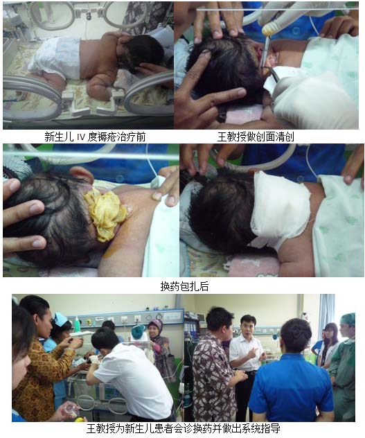 在醫(yī)療開(kāi)發(fā)過(guò)程中,醫(yī)療團(tuán)隊(duì)還進(jìn)行了兩次會(huì)診:大面積燒傷及新生兒IV度褥瘡,其中新生兒的會(huì)診具有特別重要的意義。由于當(dāng)?shù)蒯t(yī)生對(duì)于褥瘡的治療經(jīng)驗(yàn)不足,沒(méi)有及時(shí)正確處理創(chuàng)面,導(dǎo)致新生兒褥瘡由淺度小面積創(chuàng)面加重為大面積IV度創(chuàng)面,病情危險(xiǎn),成為全科最棘手的病例。王教授針對(duì)這類(lèi)典型的病例做了專(zhuān)業(yè)的診斷,發(fā)現(xiàn)了創(chuàng)面惡化的根源,并親自為患者處理創(chuàng)面、示范換藥,而后制定了后期治療方案并強(qiáng)調(diào)了重點(diǎn)注意事項(xiàng)及關(guān)鍵環(huán)節(jié),解決了醫(yī)務(wù)人員的難題,他們不禁感嘆,多虧了再生醫(yī)學(xué),才得以挽救這條幼小的生命。
