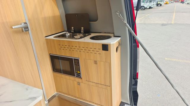 輕推沙發(fā)床中間的門,內(nèi)部乾坤一覽無余,車輛尾部巧妙地嵌入了廚房與衛(wèi)生間的設(shè)施,仿佛是家中的私密天地,左側(cè)的吧臺設(shè)計,既可在沐浴時放置洗漱用品,又可在烹飪時作為臨時操作臺,實用又貼心。
