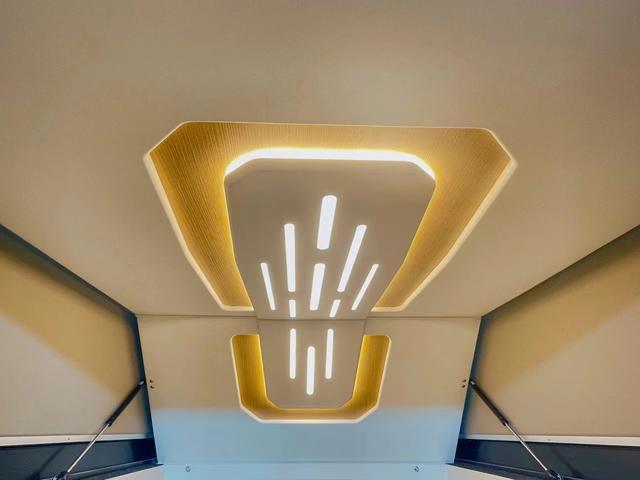 更令人驚嘆的是,車頂上安裝了400瓦的太陽能板,仿佛是一片片綠色的葉子,為我們在戶外旅行中提供了源源不斷的電力,而右側(cè)車頂上有一個寬2米、長3米的電動遮陽棚,只需輕輕一按便能優(yōu)雅地展開。