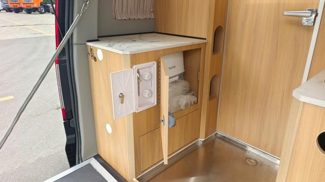 若車上的電磁爐無法滿足需求,我們還可以外接家庭版的電磁爐,其下方的220v電源插座就是為此而設(shè),另外兩個儲物柜雖然不大,但擺放一些日常的袋裝物品綽綽有余,易碎物品則需另外安置。