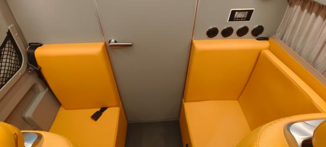 駕駛室區(qū)域給人的第一眼的感覺就是比較豪華鮮艷,儀表臺以及方向盤全部采用棕色桃木鑲嵌和米色皮革的搭配,低調(diào)又不失豪華,這種顏色搭配其實更適合年輕人,而座椅則是采用的黃色高級皮革包覆,在駕駛室里座椅的顏色是最為顯眼的,主副駕座椅還帶隱私窗簾,雖然看起來這款車比較適合女生駕駛,但是男生駕駛也是可以的,而在路上行駛的時候讓我們的心情愉悅和舒適。