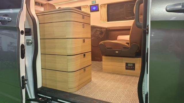 會客區(qū)對面就是我們的福特全順房車室內(nèi)廚房區(qū)域,靠近進門的左側(cè)是各種深淺不同的儲物抽屜,供我們存放各種餐具,抽屜是帶鎖扣的,就算在行駛中,也能保證餐具不會損壞,廚房吧臺臺面安裝一個800瓦電磁爐和抽拉式水龍以及304不銹鋼洗菜池,下面還要柴暖開關(guān)、50升房車專用冰箱、微波爐等設(shè)施,基本上廚房所需要的功能都聚集在這里了。