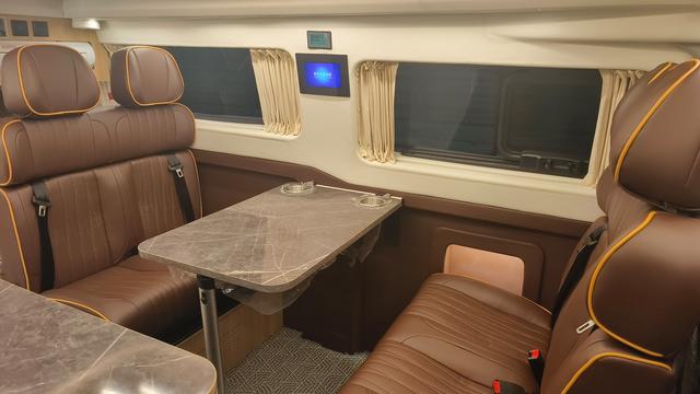 駕駛室后面就是4人沙發(fā)對卡座和一張便攜式的餐桌,餐桌上還有兩個杯托,來了親朋好友我們可以在車上坐在這里一起喝個茶或者是娛樂一下都是可以的,餐桌上面就是7寸觸摸屏控制系統(tǒng),主要控制房車內(nèi)部的所以電路,在往上就是電池電量以及太陽能板給電池的動態(tài)顯示器,到了晚上我們的會客區(qū)就可以變成一張長2米、寬80厘米的單床,這完全可以和我們現(xiàn)實生活中的家庭相提并論了,雖然床鋪小點,但是最起碼是我們個人的私人休息區(qū),干凈又衛(wèi)生。