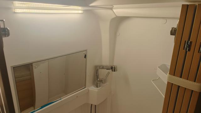 這個房車的衛(wèi)生間不是很大,只能一個人在里面洗澡,衛(wèi)生間的門是折疊式的,而且里面還有一個暖風(fēng)出口,我們在里面洗澡也不會很冷,衛(wèi)生間主要配備了隱藏式洗臉池、抽拉式淋浴花灑、盒式抽拉馬桶等設(shè)施,滿足了我們在戶外解決個人衛(wèi)生問題。